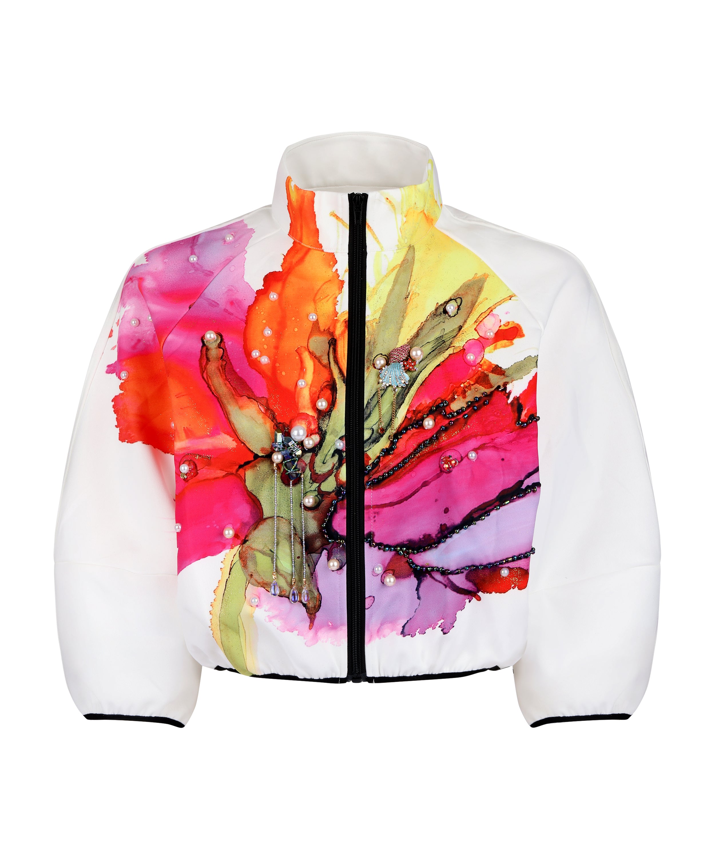 • Statement ¾ sleeve jacket designed to turn every moment into a main character moment • Features a bold, hand-painted inspired bloom print in vibrant pink, red, and golden hues • Embellished with delicate pearl and crystal details for that signature glam sparkle • Lightweight yet structured for a flattering, elevated silhouette • Cropped fit for a modern, fashion-forward edge • Front zip closure with sleek black contrast trim • Designed to stand out—perfect for day-to-night styling